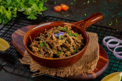 Crispy okra on the bed of lababdar masala. (ALLERGENS: Dairy)